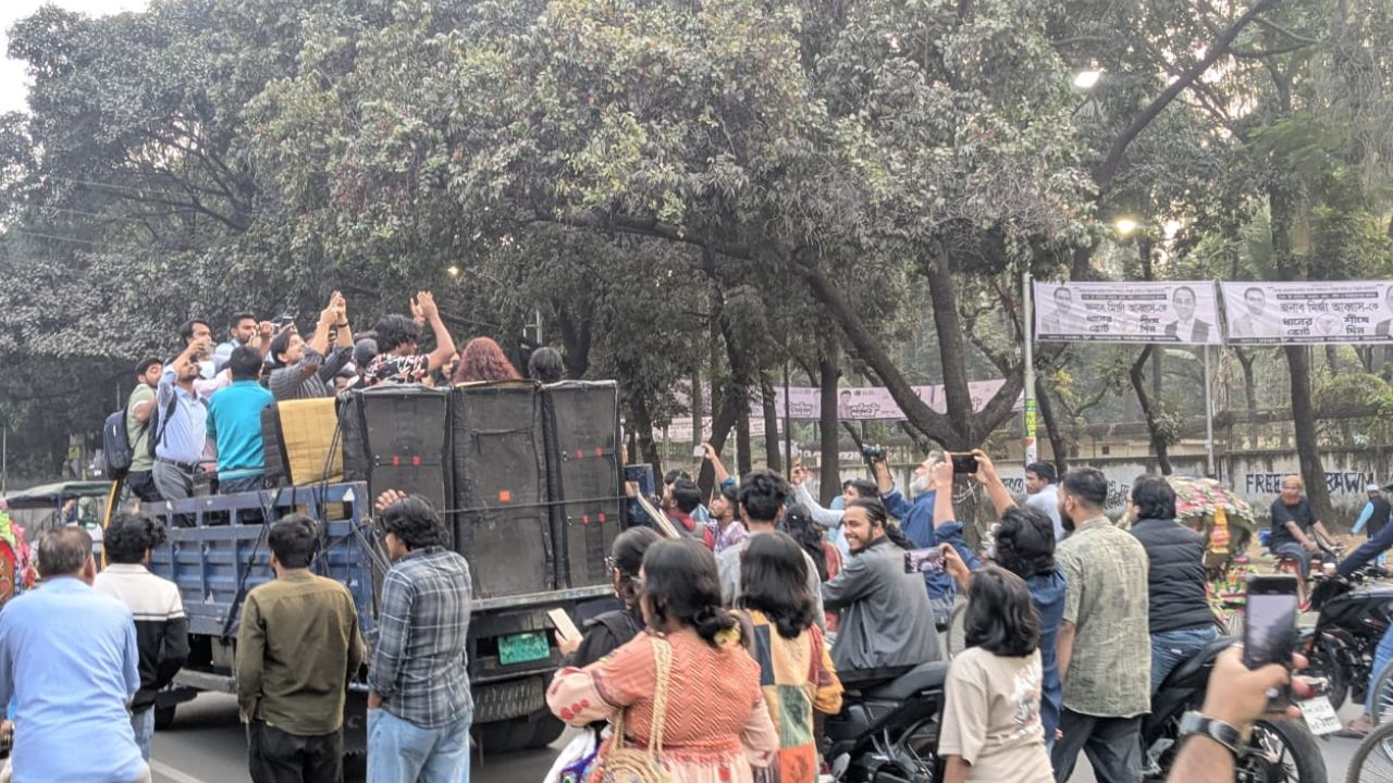 During the procession, students played songs condemning the “Razakar” and “Al-Badr,” along with various parody tracks targeting war criminals.